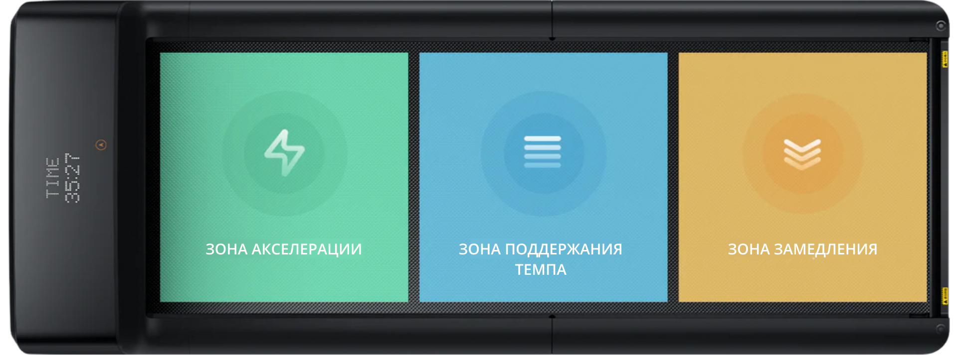 В режиме ходьбы пользователю не нужно использовать пульт дистанционного управления. Досаточно наступить в переднюю часть тренировочной платформы для автоматического запуска и ускорения тренажера. Чтобы снизить скорость или замедлить тренажер, используйте заднюю часть тренировочной зоны.